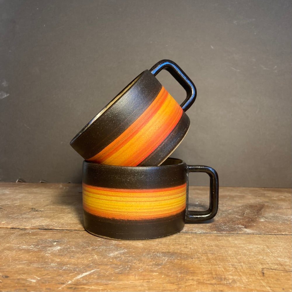 Inspired by the Margate sunsets Thrown on wheel using buff stoneware clay then hand painted with oxides and underglaze. Interior Glazed with transparent glaze. Each mug is slightly different.